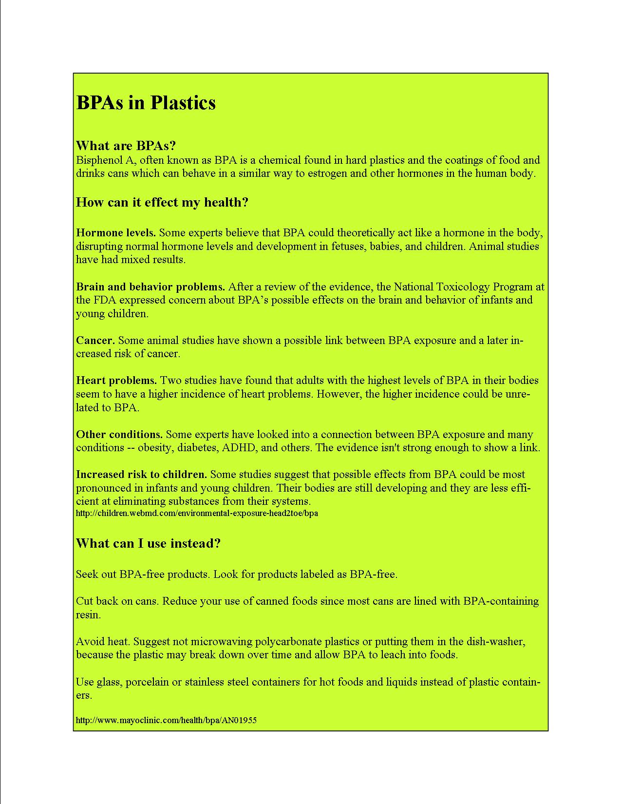 When we first found out about BPAs a year ago, we started to look at all our plastic and boy did we have lots. I replaced the plastic storage containers we had with glass ones. We bought aluminum and BPA free water bottles. I went from having a cupboard of cans to having none. I now buy fresh, frozen or jarred foods exclusively. Step by step I got this stuff out. Currently there are many storage containers now that are BPA free available to make this change easier. Beware of disposable water bottles being left in the sunshine and microwaving food in plastic containers. Remember heat and plastic are not a smart idea.